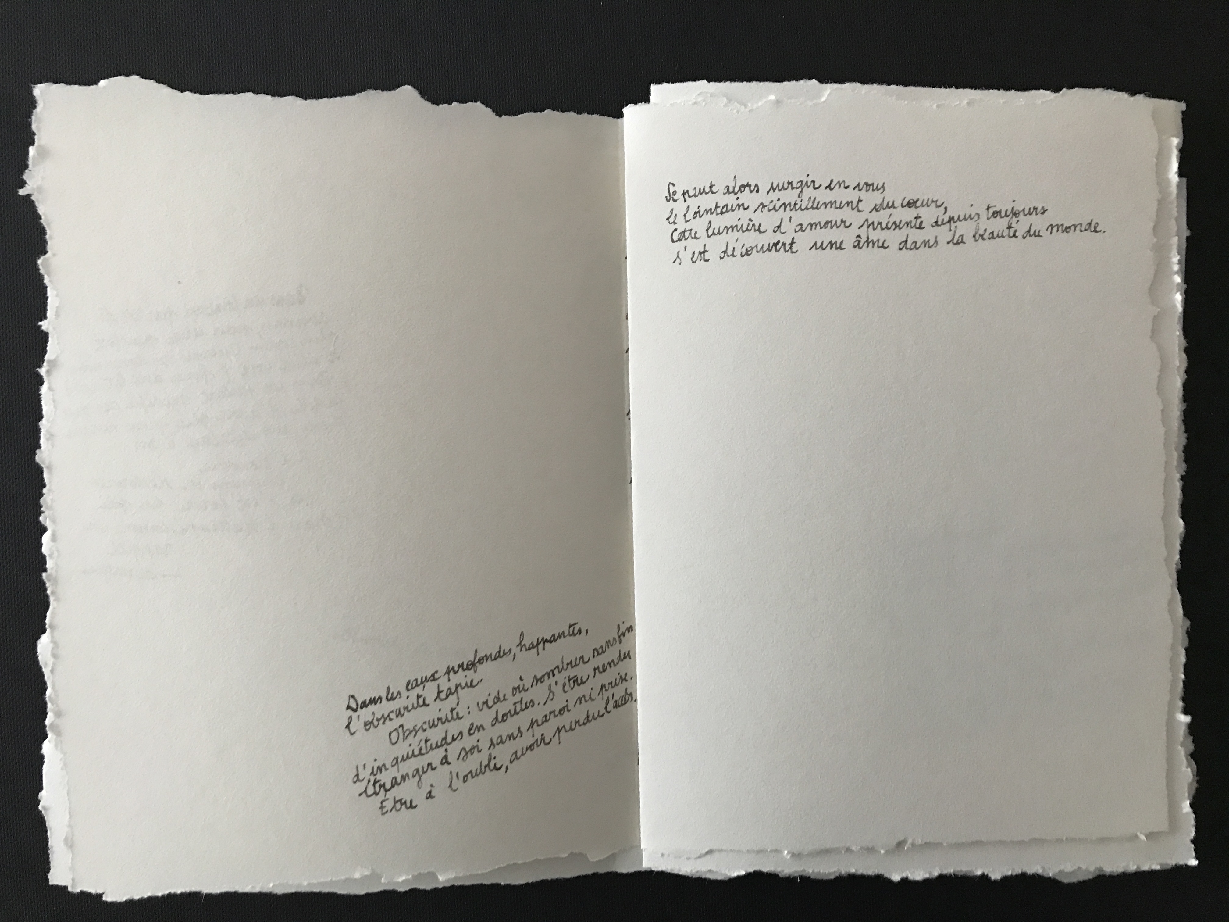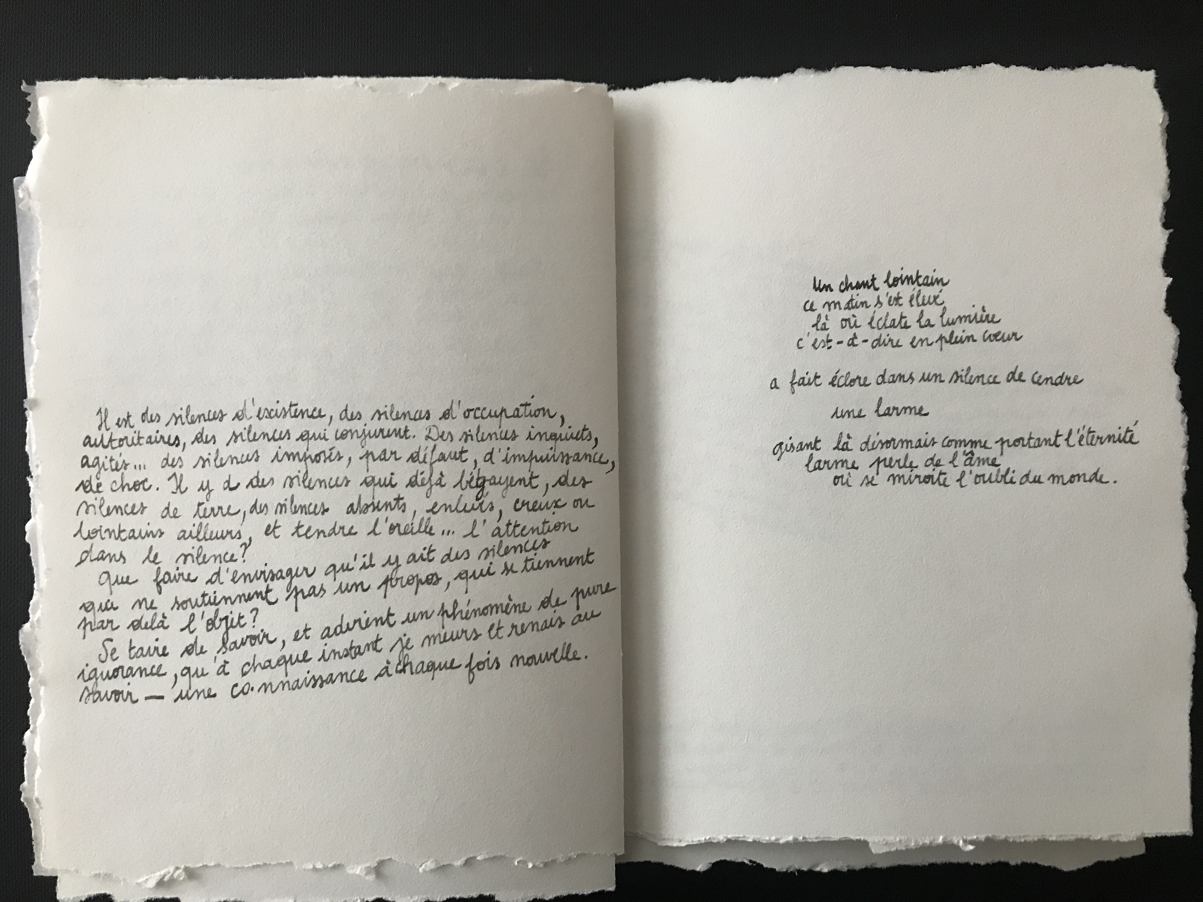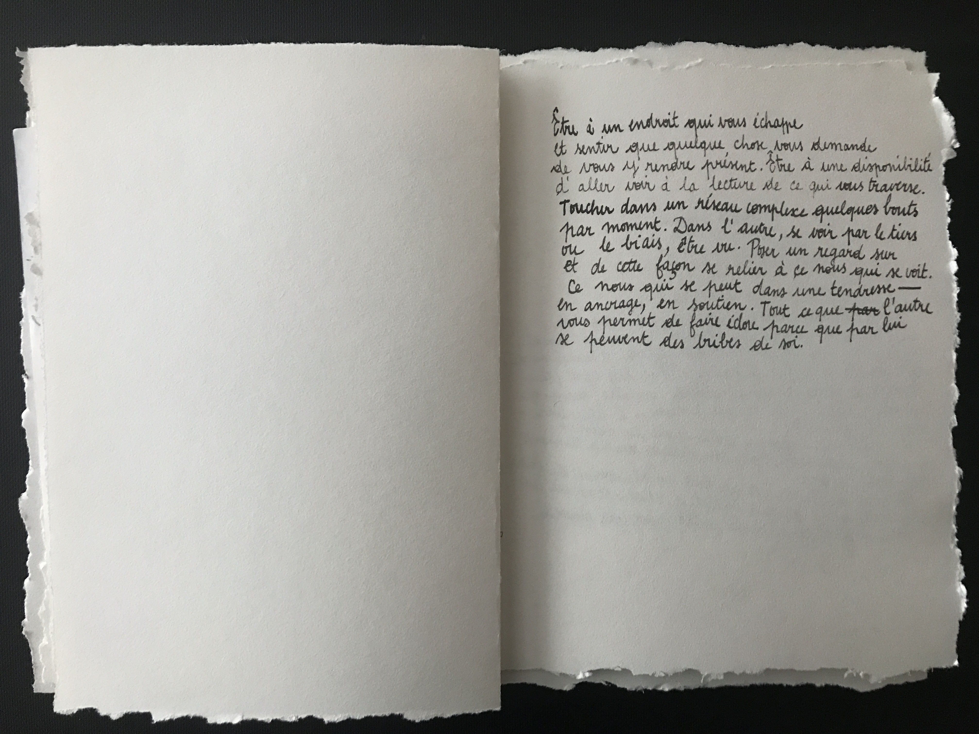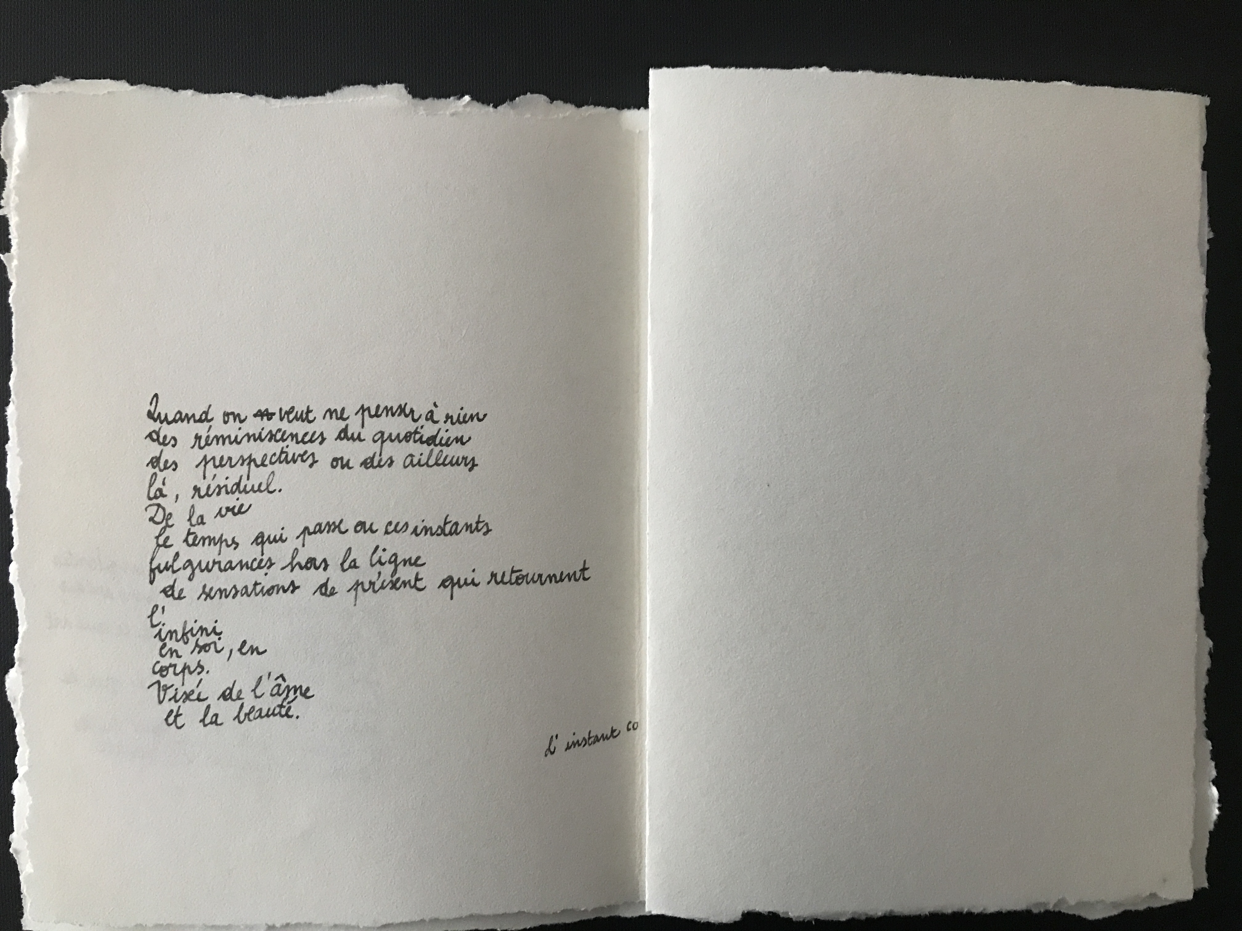 III Formes ouvertes 05 [écriture] Notes et pensées, 2020-… [poésie] Prépositions, De l’espace, février 2020 - [poésie] Éclats, De l’âme, février 2020 / 04 [son] Mélodie 01, Mercredi des Cendres, 1 min 36, mars 2020, Saint-Étienne - [son] Déambulation 01, Rhizome, 1 min 46, décembre 2019, Saint-Étienne / 03 [image] Visuels pour Pryapisme (formation musicale de Clermont-Ferrand), 2015-2018 / 02 [interactivité] Essais sur le mouvement, 2011, Chaumont / 01 [image] Carnets et feuilles volantes, 2019-… / II Capture 04 [lecture] Collectes mars 2020, extraits sur l’âme, la beauté et le sens du faire / 03 [photographie] Prises de vue, 2016-2019 / 02 [vidéo]  Motifs, 3 min 47, 2016-2019 / 01 [son] Captures, I Métro Paris, jeu. 02.05.2019 à 12.30, 2 min 51, 2019 - II Violons Montreuil, 17.02.2018 à 20.30, 1 min 46, 2018 / I Méditations 05 [son] méditation 02, Le Grand Bain, 3 min 46, février 2020, Saint-Étienne / 04 [son] méditation 01, Équinoxe, 5 min 28, novembre 2019, Saint-Étienne / 03 [image] image 02, série Ressources, octobre 2019, marqueurs, 458 x 648 mm, Saint-Étienne / 02 [image] image 01, série Ressources, septembre 2019, marqueurs, 458 x 648 mm, Saint-Étienne / 01 [image] Écrans, septembre 2019, marqueurs, 670 x 600 mm, Saint-Étienne