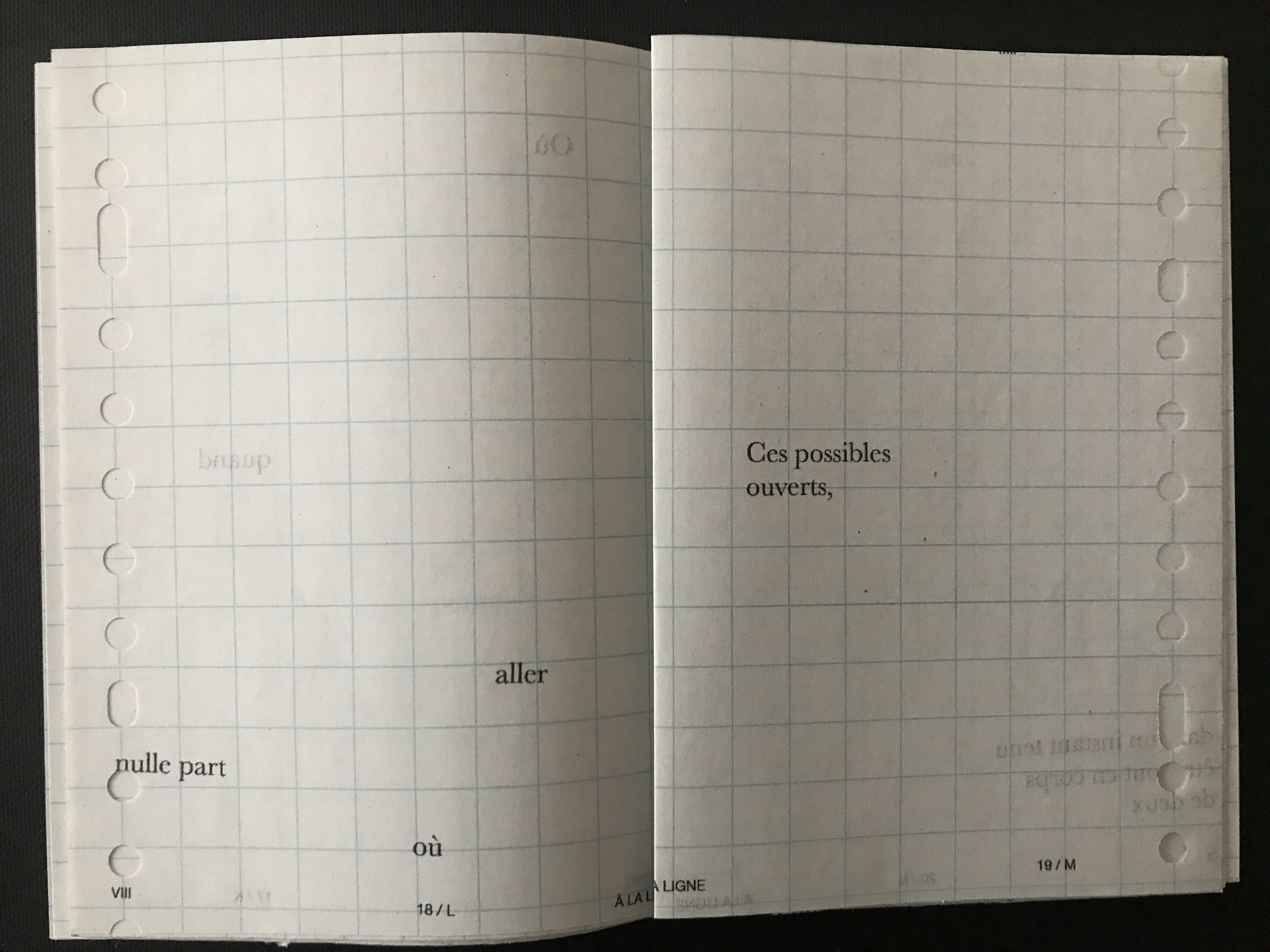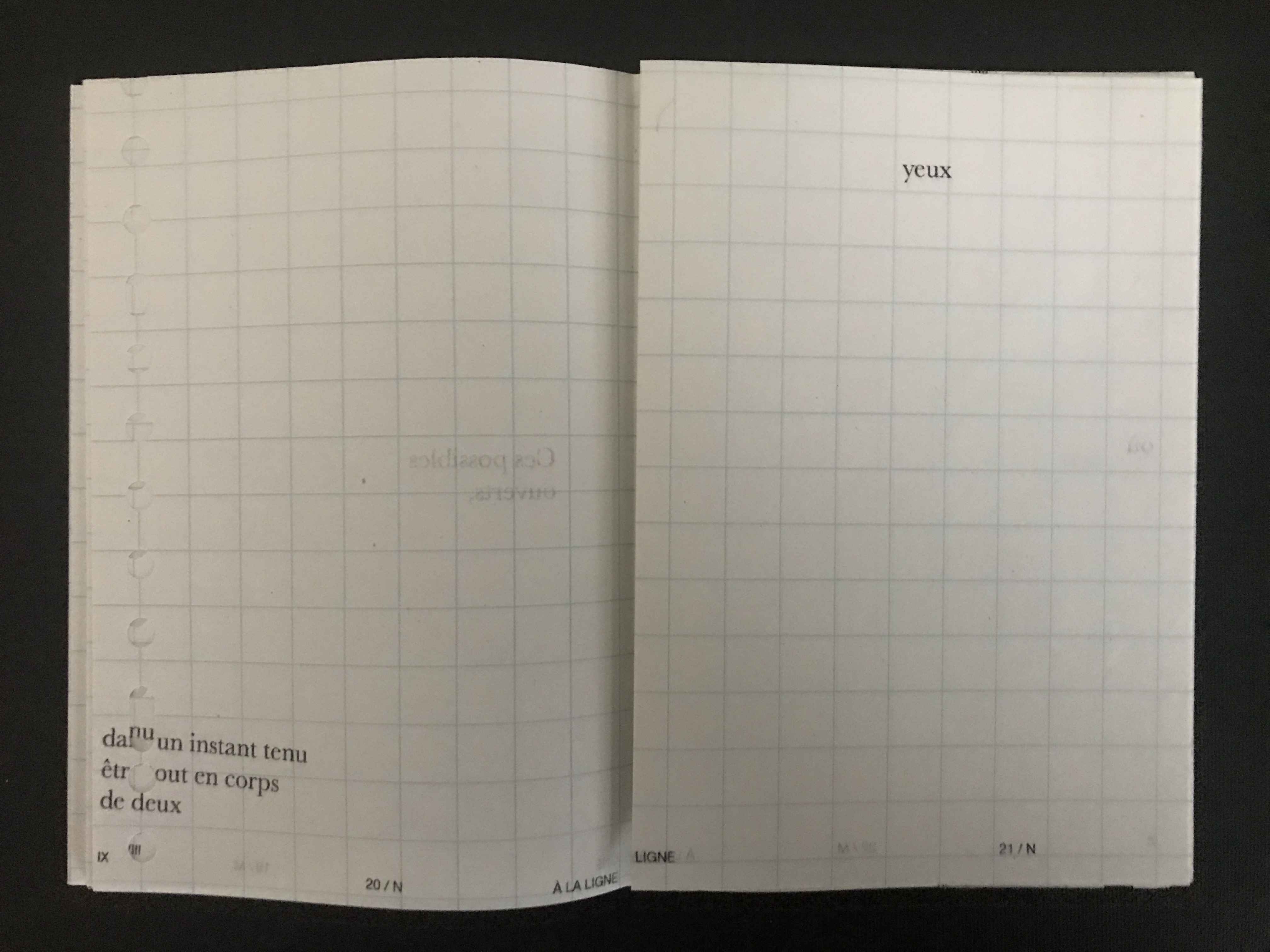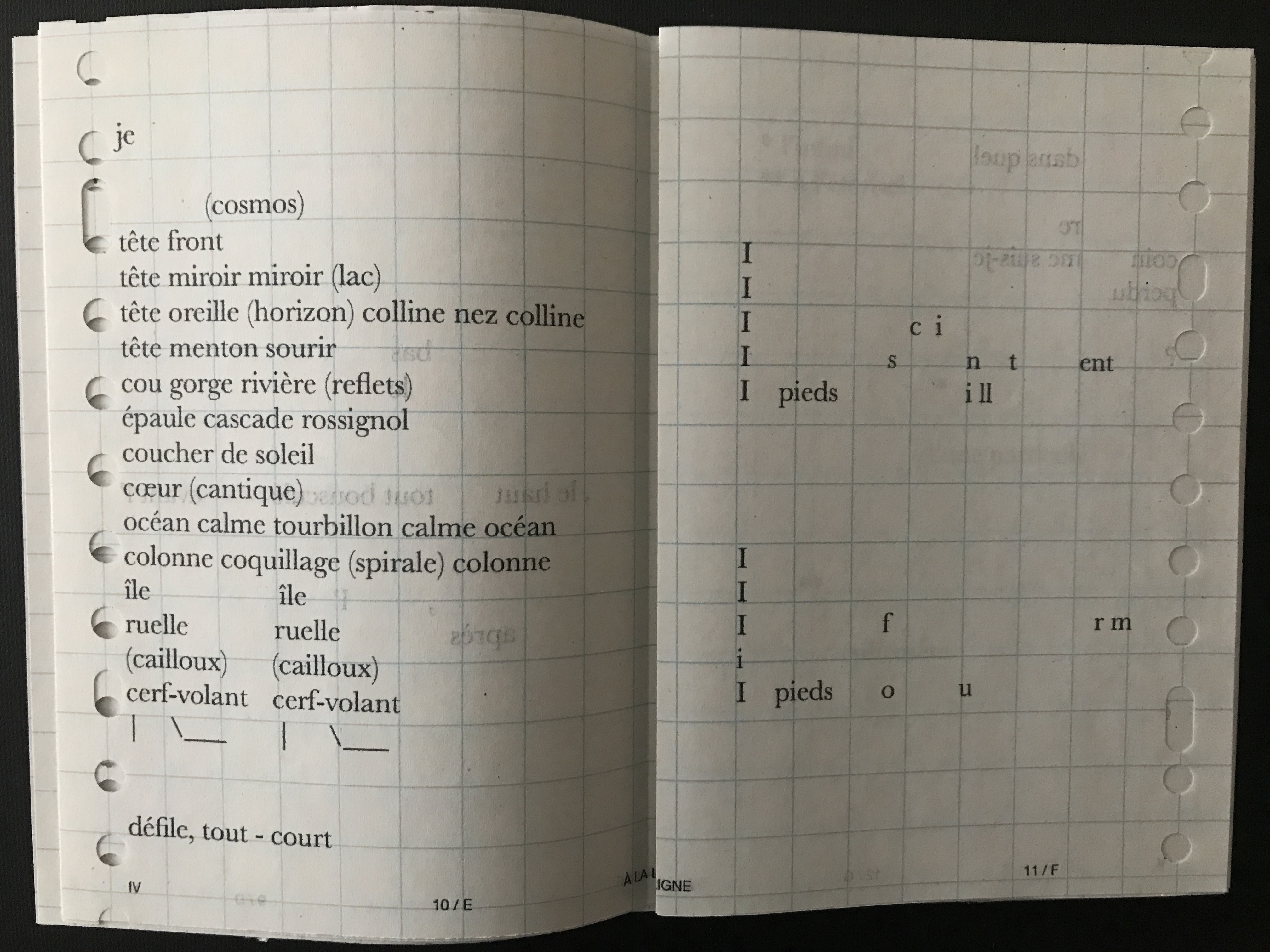 III Formes ouvertes 05 [écriture] Notes et pensées, 2020-… [poésie] Prépositions, De l’espace, février 2020 - [poésie] Éclats, De l’âme, février 2020 / 04 [son] Mélodie 01, Mercredi des Cendres, 1 min 36, mars 2020, Saint-Étienne - [son] Déambulation 01, Rhizome, 1 min 46, décembre 2019, Saint-Étienne / 03 [image] Visuels pour Pryapisme (formation musicale de Clermont-Ferrand), 2015-2018 / 02 [interactivité] Essais sur le mouvement, 2011, Chaumont / 01 [image] Carnets et feuilles volantes, 2019-… / II Capture 04 [lecture] Collectes mars 2020, extraits sur l’âme, la beauté et le sens du faire / 03 [photographie] Prises de vue, 2016-2019 / 02 [vidéo] Motifs, 3 min 47, 2016-2019 / 01 [son] Captures, I Métro Paris, jeu. 02.05.2019 à 12.30, 2 min 51, 2019 - II Violons Montreuil, 17.02.2018 à 20.30, 1 min 46, 2018 / I Méditations 05 [son] méditation 02, Le Grand Bain, 3 min 46, février 2020, Saint-Étienne / 04 [son] méditation 01, Équinoxe, 5 min 28, novembre 2019, Saint-Étienne / 03 [image] image 02, série Ressources, octobre 2019, marqueurs, 458 x 648 mm, Saint-Étienne / 02 [image] image 01, série Ressources, septembre 2019, marqueurs, 458 x 648 mm, Saint-Étienne / 01 [image] Écrans, septembre 2019, marqueurs, 670 x 600 mm, Saint-Étienne
