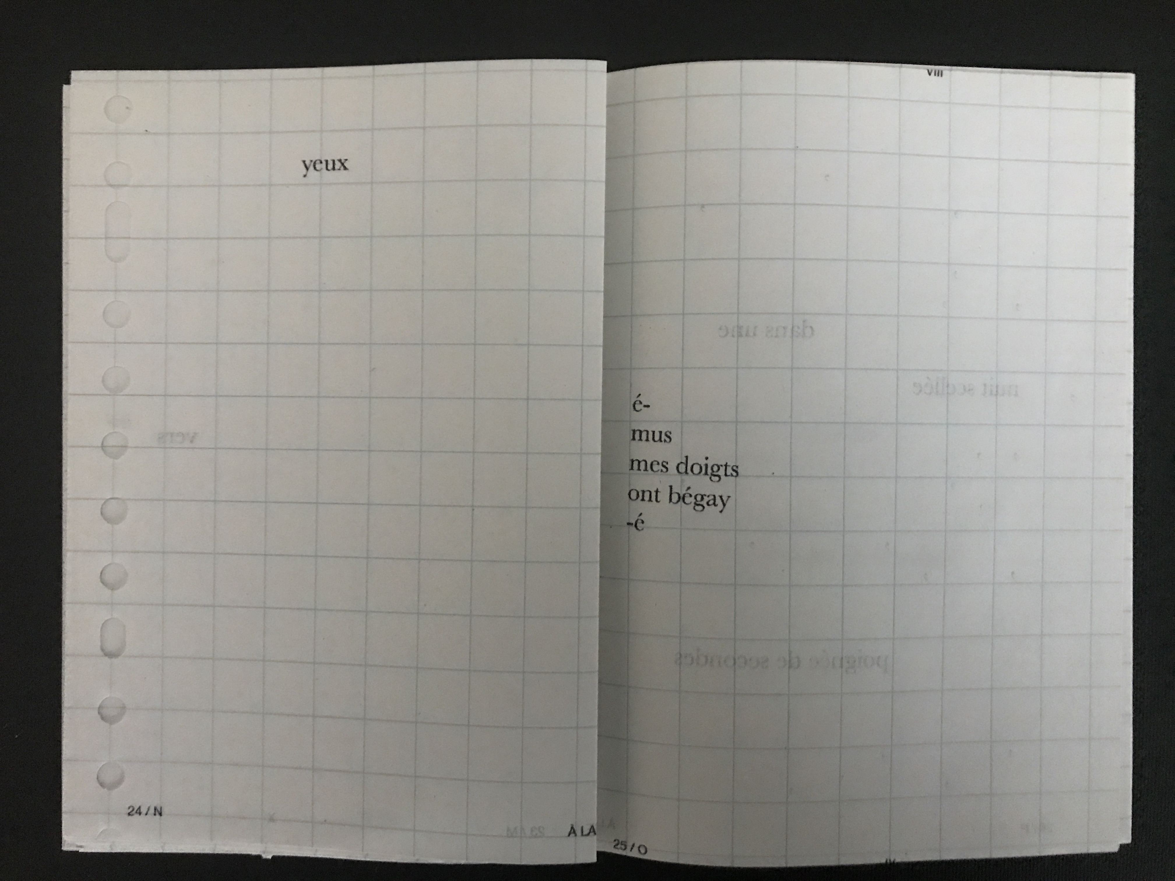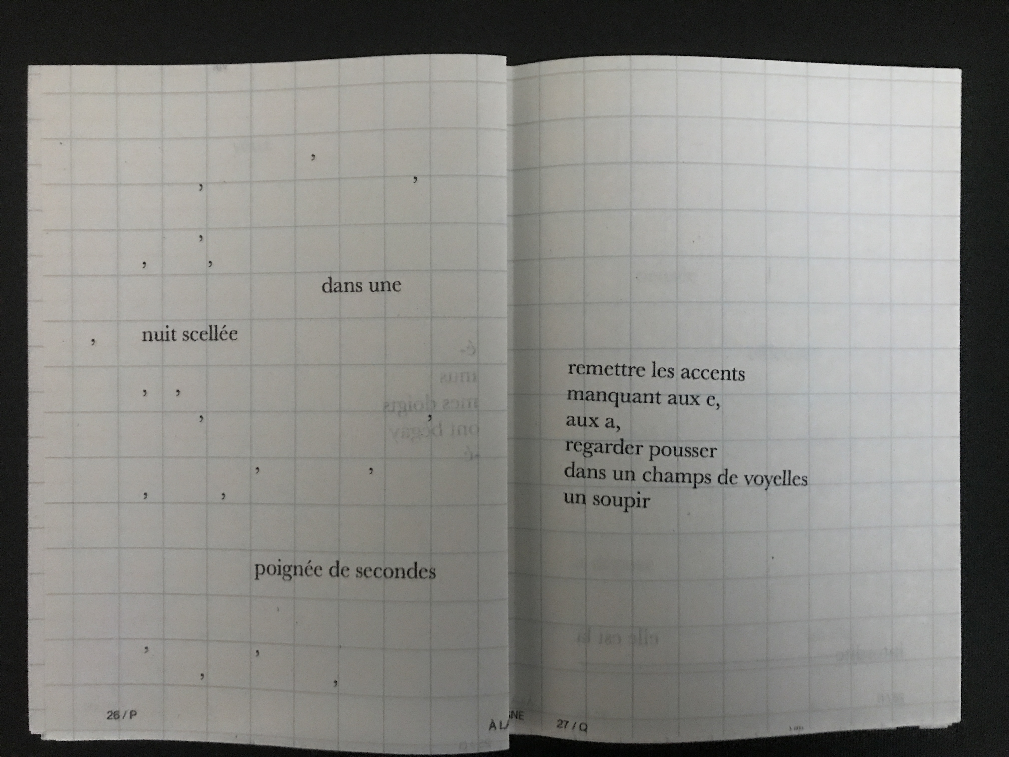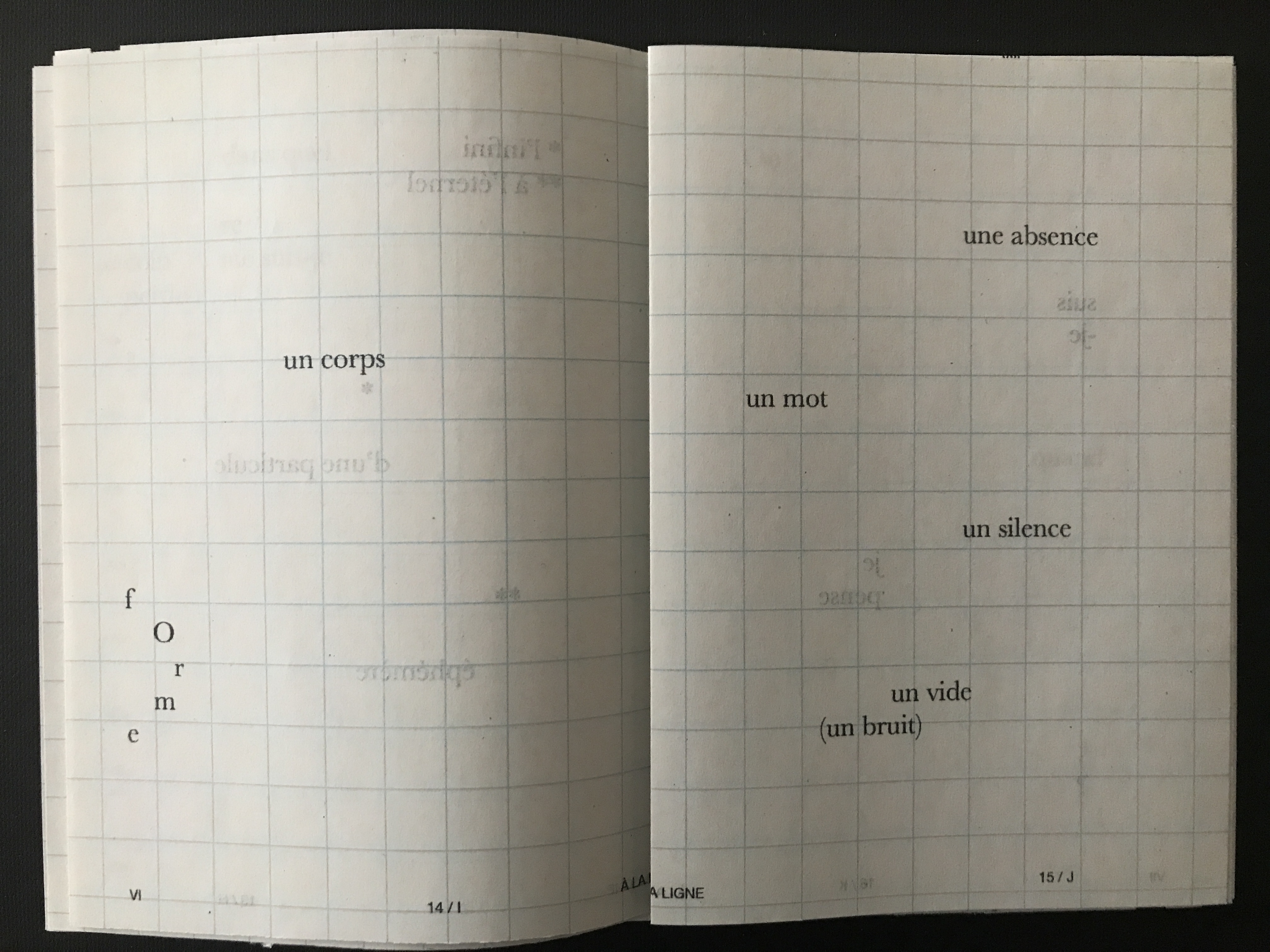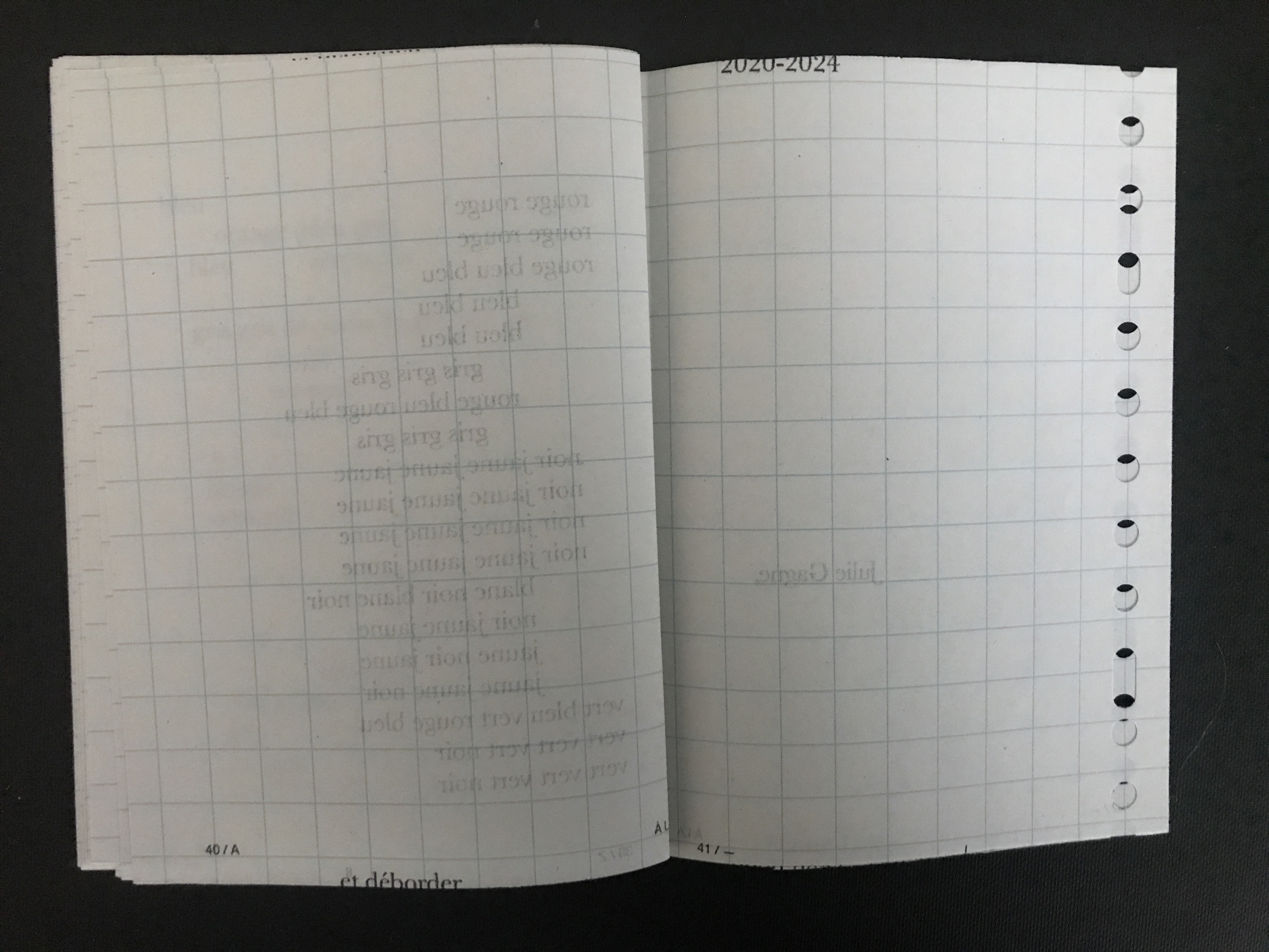 III Formes ouvertes 05 [écriture] Notes et pensées, 2020-… [poésie] Prépositions, De l’espace, février 2020 - [poésie] Éclats, De l’âme, février 2020 / 04 [son] Mélodie 01, Mercredi des Cendres, 1 min 36, mars 2020, Saint-Étienne - [son] Déambulation 01, Rhizome, 1 min 46, décembre 2019, Saint-Étienne / 03 [image] Visuels pour Pryapisme (formation musicale de Clermont-Ferrand), 2015-2018 / 02 [interactivité] Essais sur le mouvement, 2011, Chaumont / 01 [image] Carnets et feuilles volantes, 2019-… / II Capture 04 [lecture] Collectes mars 2020, extraits sur l’âme, la beauté et le sens du faire / 03 [photographie] Prises de vue, 2016-2019 / 02 [vidéo] Motifs, 3 min 47, 2016-2019 / 01 [son] Captures, I Métro Paris, jeu. 02.05.2019 à 12.30, 2 min 51, 2019 - II Violons Montreuil, 17.02.2018 à 20.30, 1 min 46, 2018 / I Méditations 05 [son] méditation 02, Le Grand Bain, 3 min 46, février 2020, Saint-Étienne / 04 [son] méditation 01, Équinoxe, 5 min 28, novembre 2019, Saint-Étienne / 03 [image] image 02, série Ressources, octobre 2019, marqueurs, 458 x 648 mm, Saint-Étienne / 02 [image] image 01, série Ressources, septembre 2019, marqueurs, 458 x 648 mm, Saint-Étienne / 01 [image] Écrans, septembre 2019, marqueurs, 670 x 600 mm, Saint-Étienne